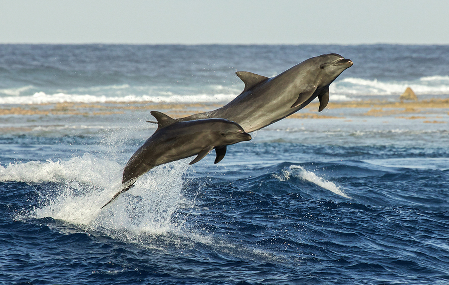 A community of 25 to 30 bottlenose dolphins resides all year round on the Tiputa Pass area and into Rangiroa lagoon. Adult bottlenose dolphins can reach up to 3.3m in length and weigh up to 450kg. The Tiputa dolphins use to surf and leap daily into long breaking waves generated by strong outgoing currents in Tiputa Pass. They may be observed from shore when the tide conditions are good.